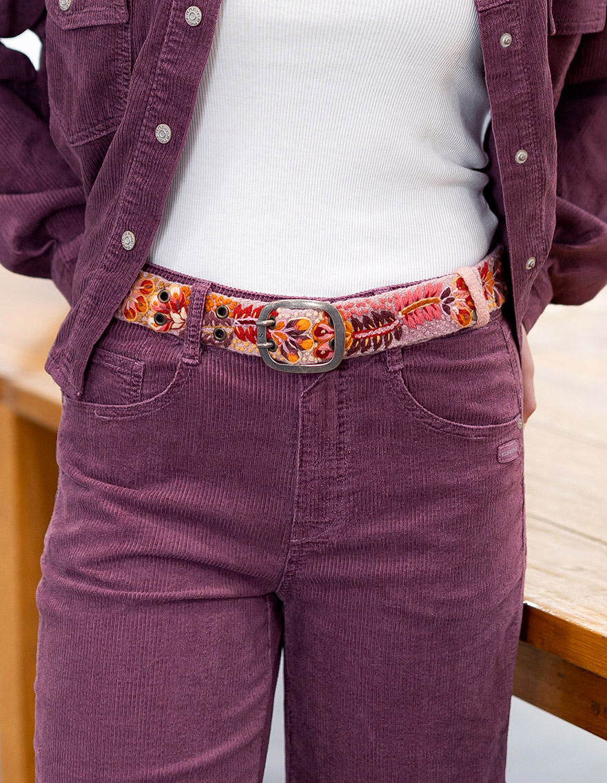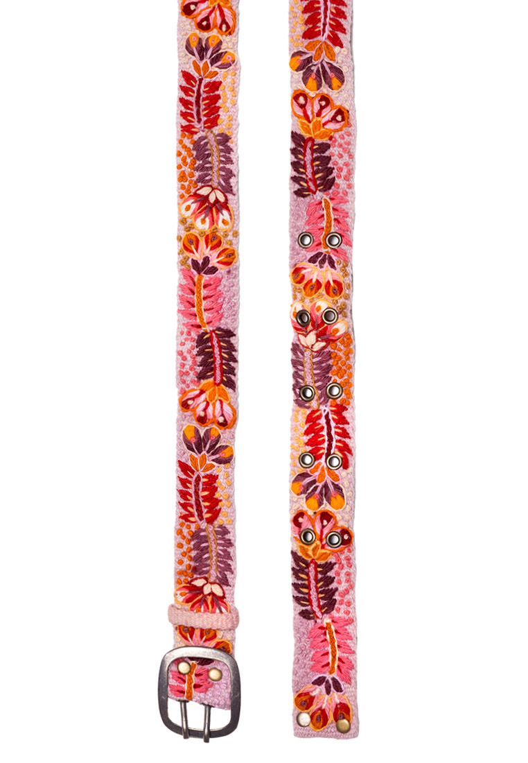 Eine von Hand gestickte wunderschöne Blätter-Blütenranke in Apricot-Lachs-Rost-Braun-Tönen machen diesen Gürtel zu einem ganz besonderen Accessoire, das bewundernde Blicke auf sich zieht.